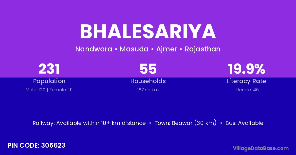 Beawar (30 km) is the nearest town to Bhalesariya village for major economic activities and is located approximately 30 km away.