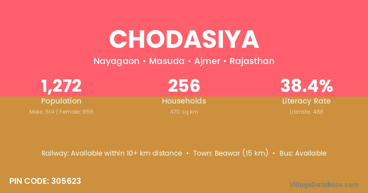 Beawar (15 km) is the nearest town to Chodasiya village for major economic activities and is located approximately 15 km away.