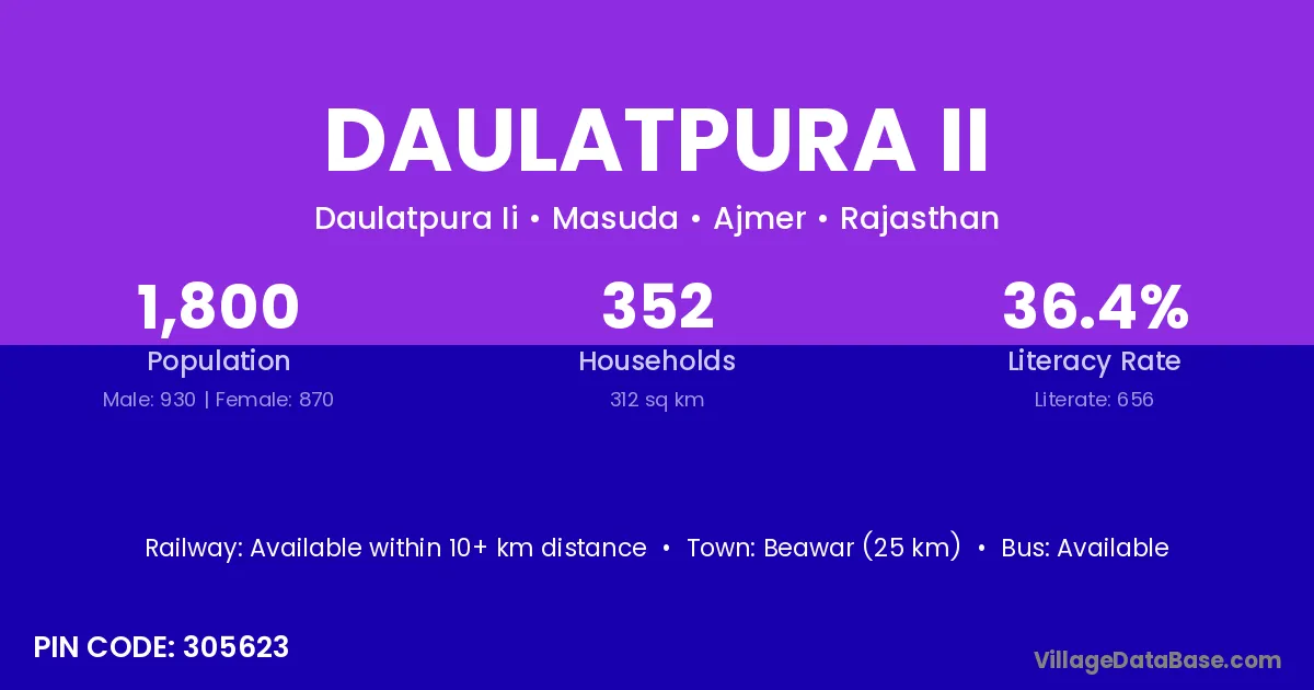 Beawar (25 km) is the nearest town to Daulatpura Ii village for major economic activities and is located approximately 25 km away.