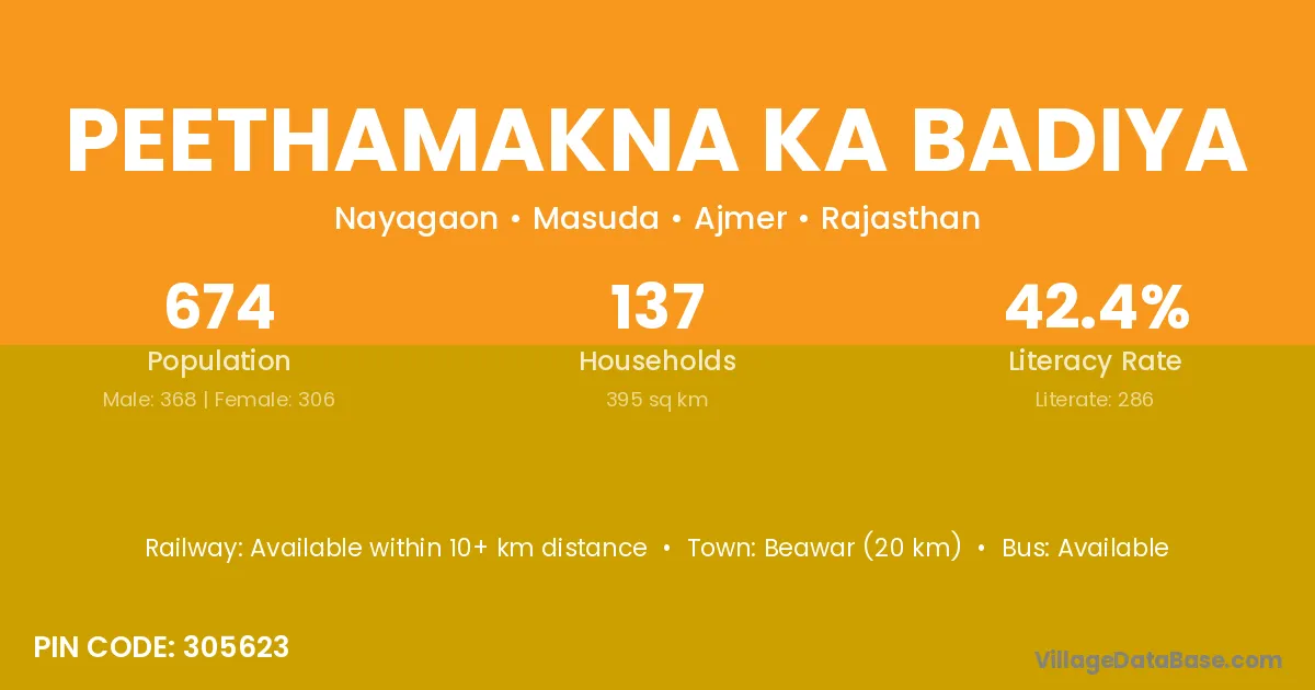 Peethamakna Ka Badiya village has a total population of 674 people, of which 368 are males and 306 are females.