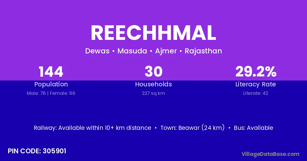 Beawar (24 km) is the nearest town to Reechhmal village for major economic activities and is located approximately 24 km away.