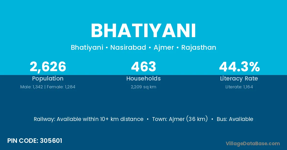 Ajmer (36 km) is the nearest town to Bhatiyani village for major economic activities and is located approximately 36 km away.
