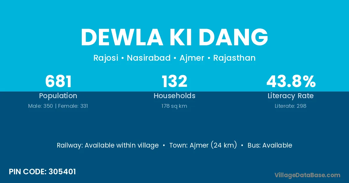 Ajmer (24 km) is the nearest town to Dewla Ki Dang village for major economic activities and is located approximately 24 km away.