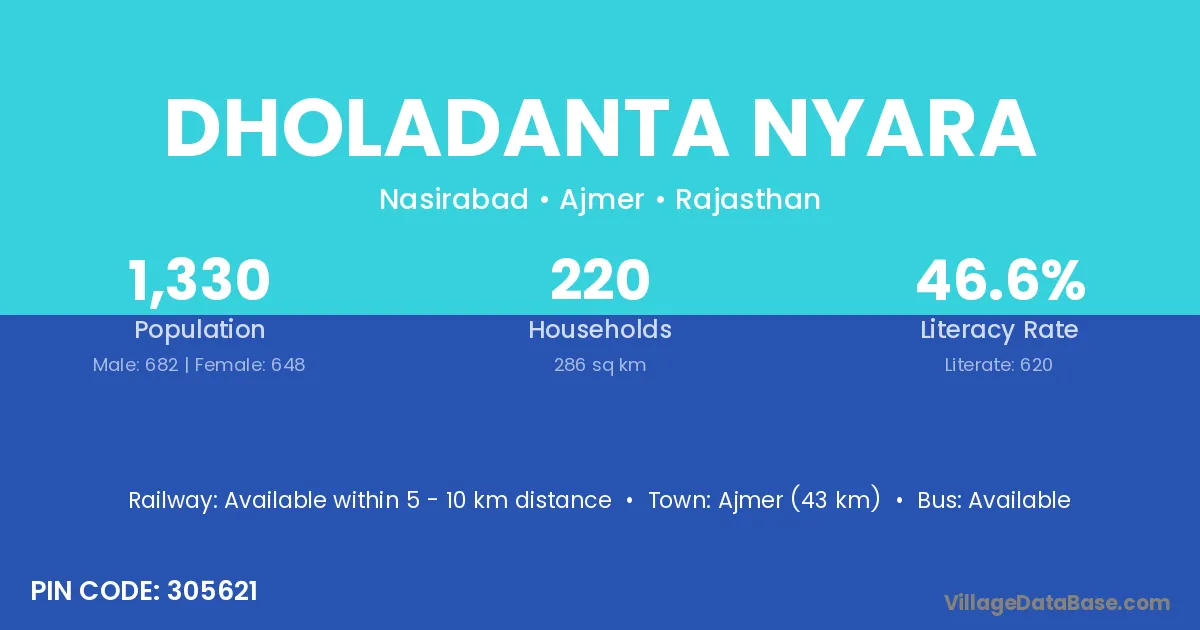 Ajmer (43 km) is the nearest town to Dholadanta Nyara village for major economic activities and is located approximately 43 km away.
