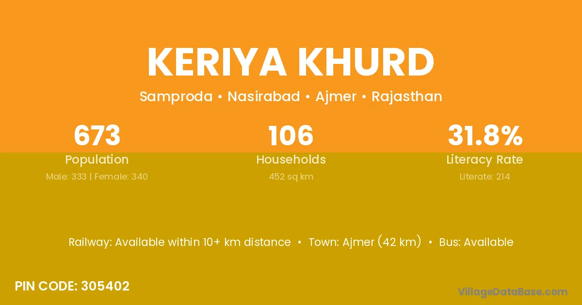 Ajmer (42 km) is the nearest town to Keriya Khurd village for major economic activities and is located approximately 42 km away.