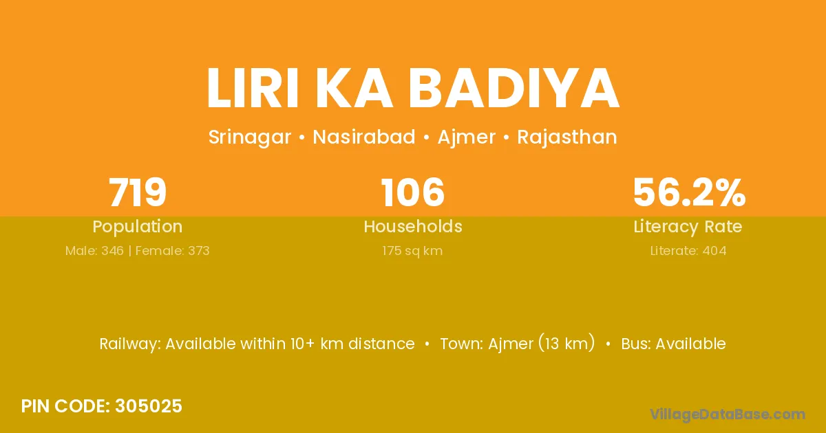 Ajmer (13 km) is the nearest town to Liri Ka Badiya village for major economic activities and is located approximately 13 km away.