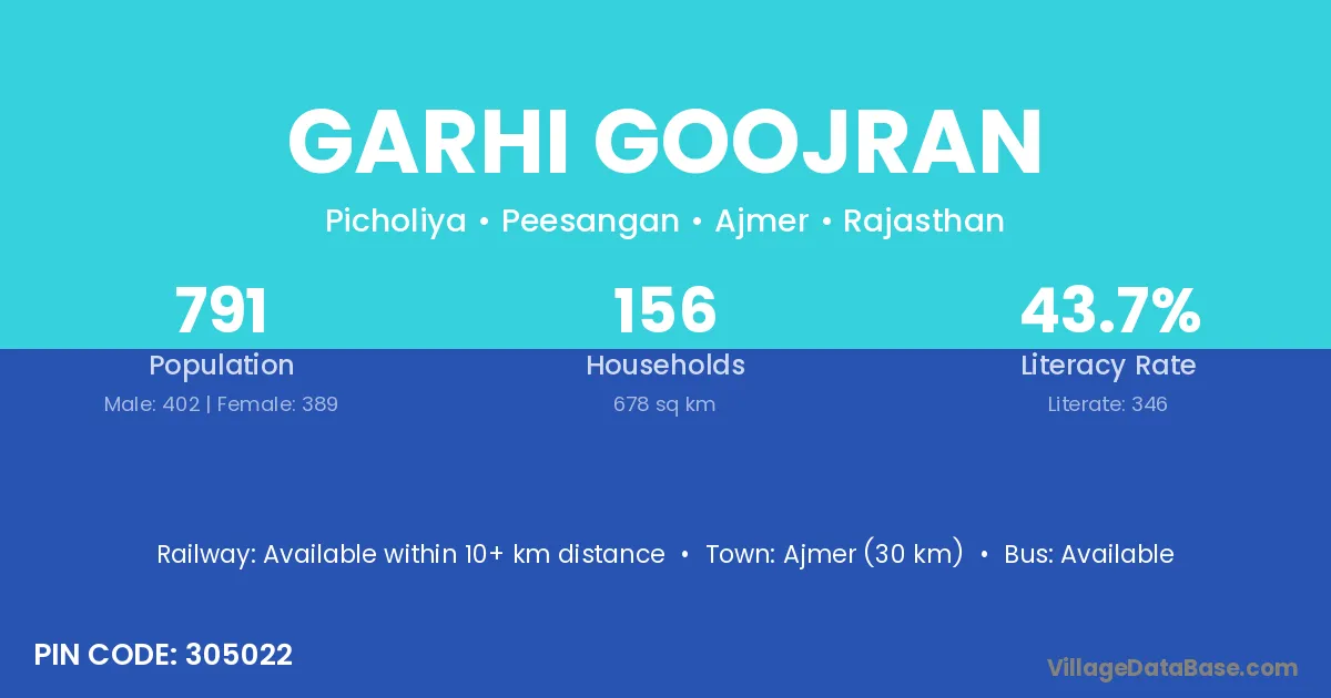 Ajmer (30 km) is the nearest town to Garhi Goojran village for major economic activities and is located approximately 30 km away.