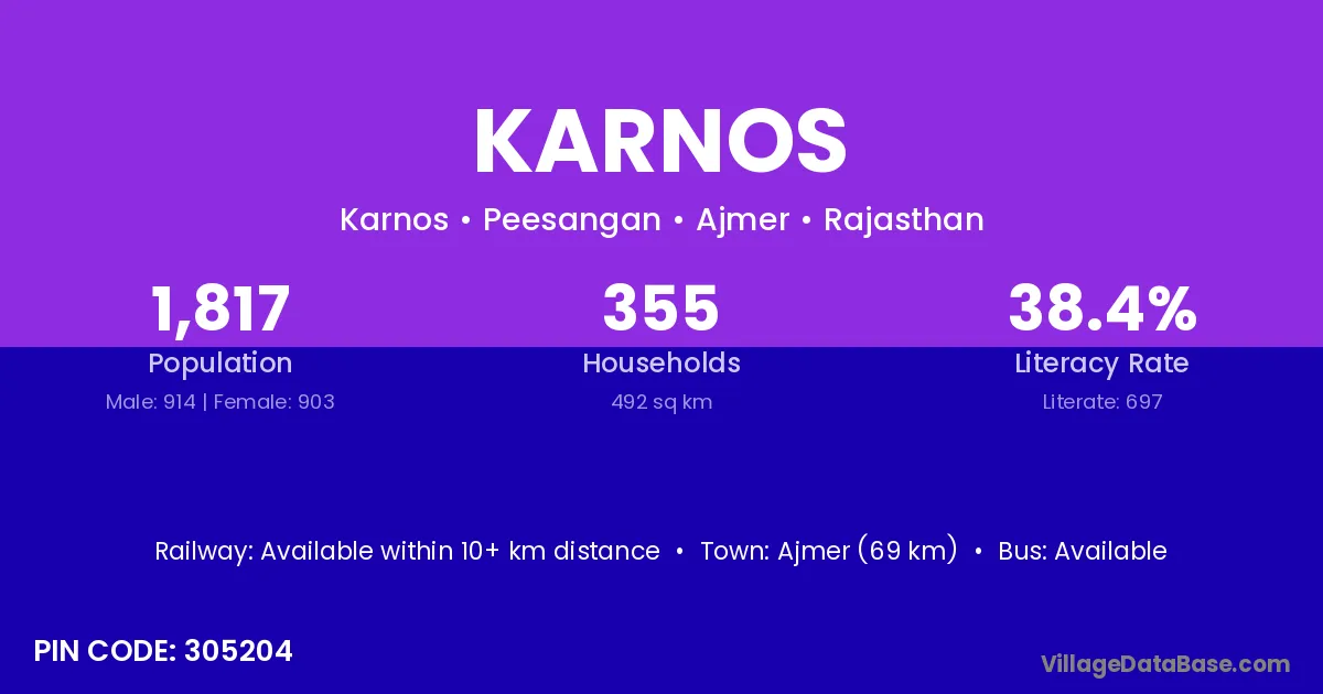 Ajmer (69 km) is the nearest town to Karnos village for major economic activities and is located approximately 69 km away.