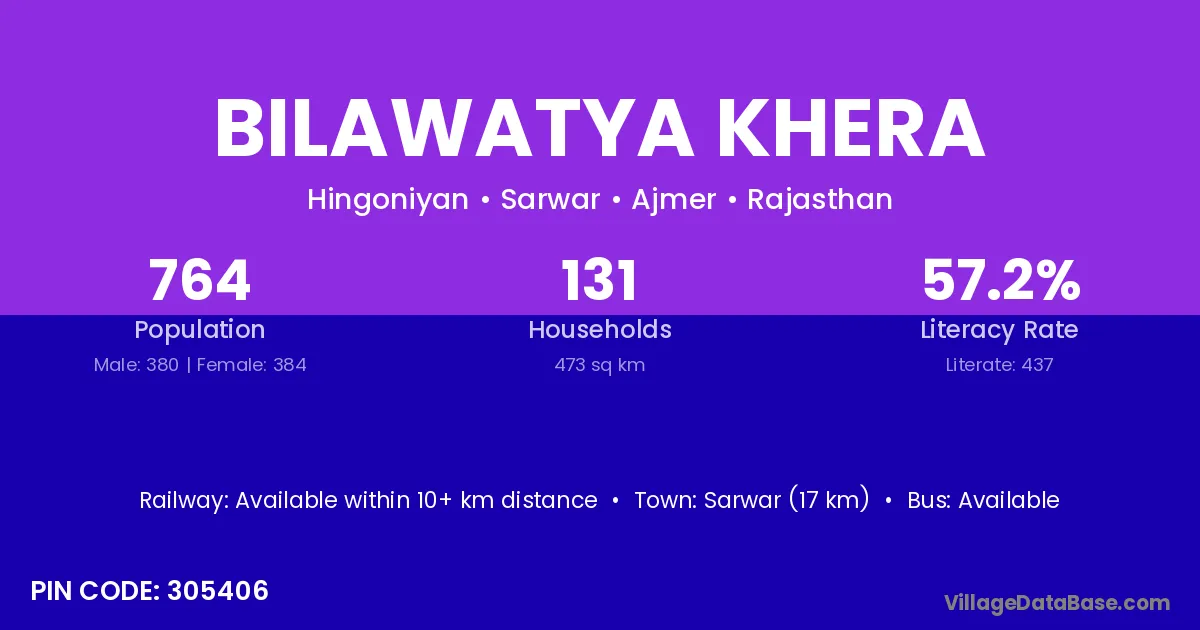 Sarwar (17 km) is the nearest town to Bilawatya Khera village for major economic activities and is located approximately 17 km away.