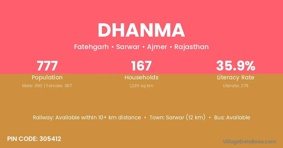 Sarwar (12 km) is the nearest town to Dhanma village for major economic activities and is located approximately 12 km away.