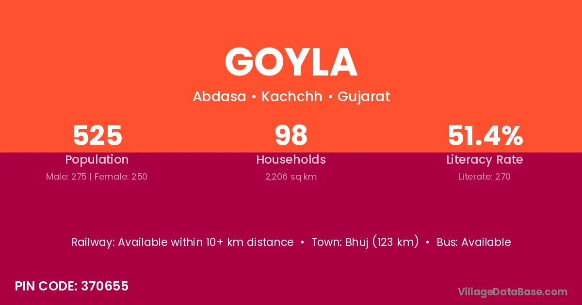 The literacy rate of Goyla village is 46.55%. Male literacy stands at 58.46% and female literacy at 33.70%.