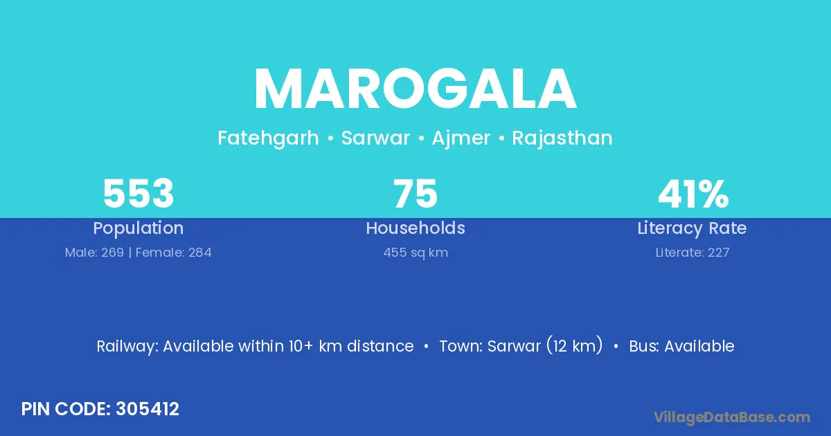 Sarwar (12 km) is the nearest town to Marogala village for major economic activities and is located approximately 12 km away.