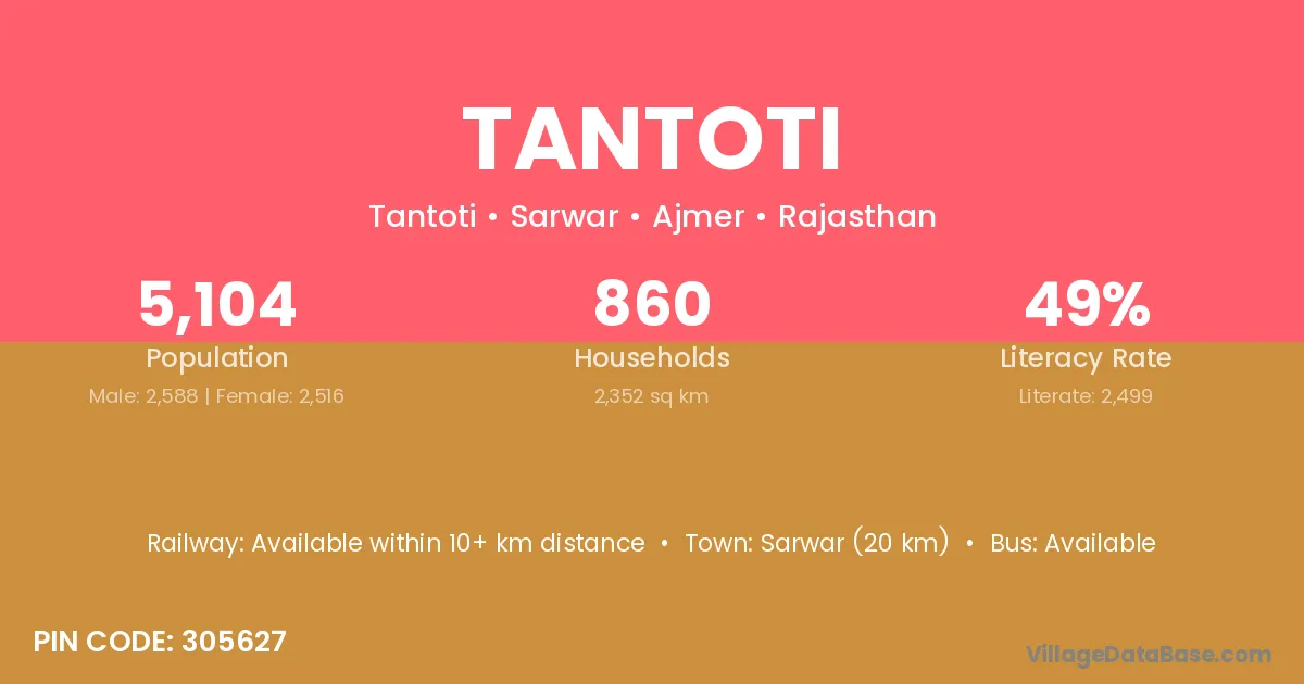 Sarwar (20 km) is the nearest town to Tantoti village for major economic activities and is located approximately 20 km away.