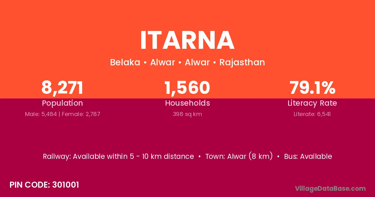 Alwar (8 km) is the nearest town to Itarna village for major economic activities and is located approximately 8 km away.