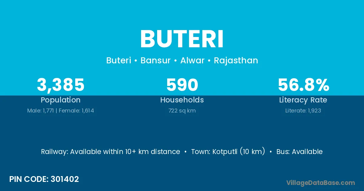 Kotputli (10 km) is the nearest town to Buteri village for major economic activities and is located approximately 10 km away.