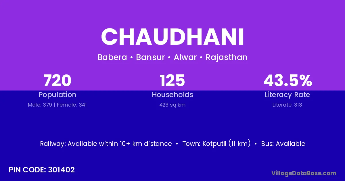 Kotputli (11 km) is the nearest town to Chaudhani village for major economic activities and is located approximately 11 km away.