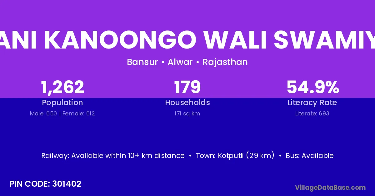 Dhani Kanoongo Wali Swamiyan village has a total population of 1,262 people, of which 650 are males and 612 are females.