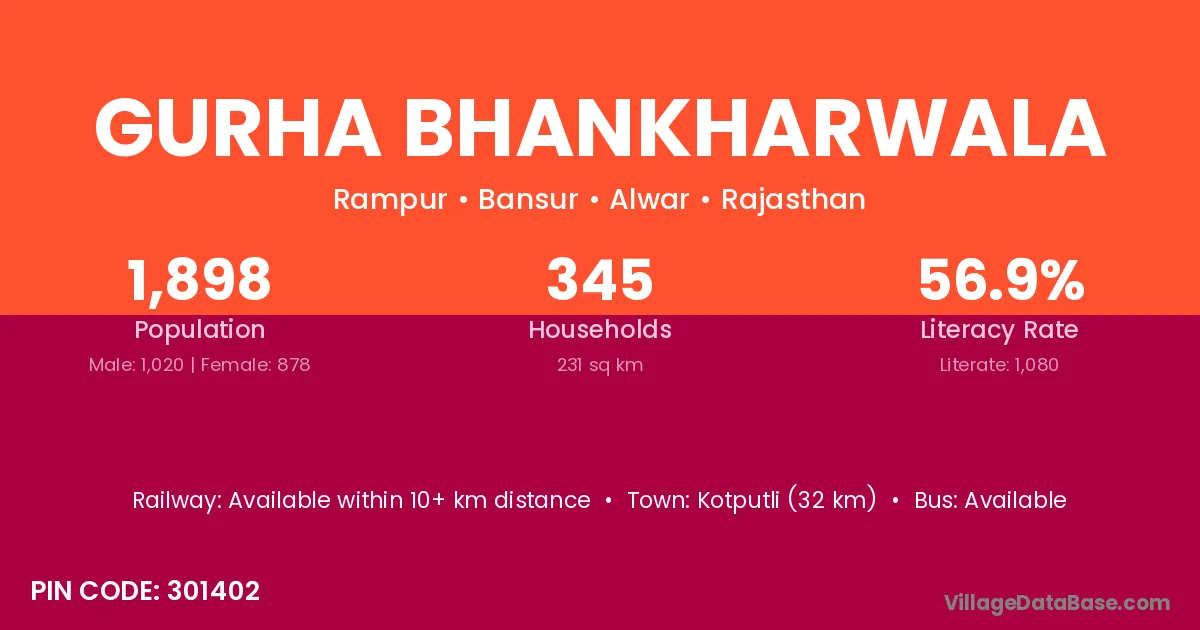 Gurha Bhankharwala village has a total population of 1,898 people, of which 1,020 are males and 878 are females.