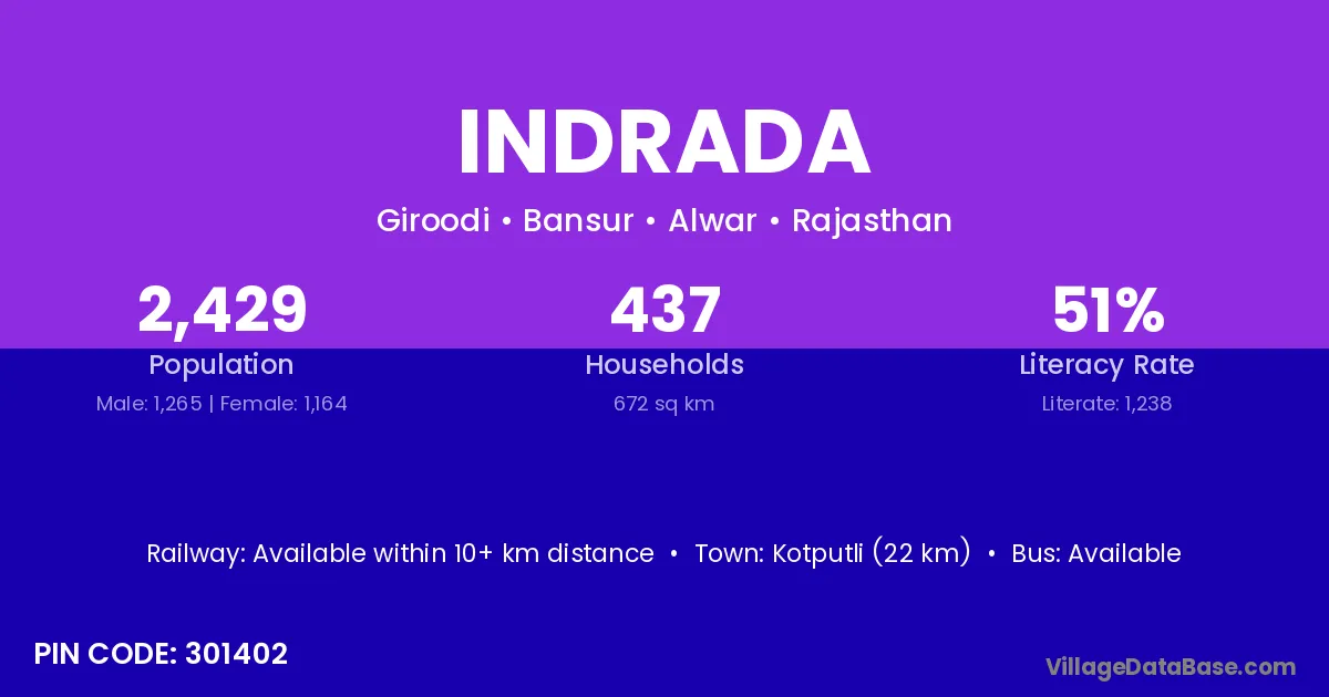 Kotputli (22 km) is the nearest town to Indrada village for major economic activities and is located approximately 22 km away.