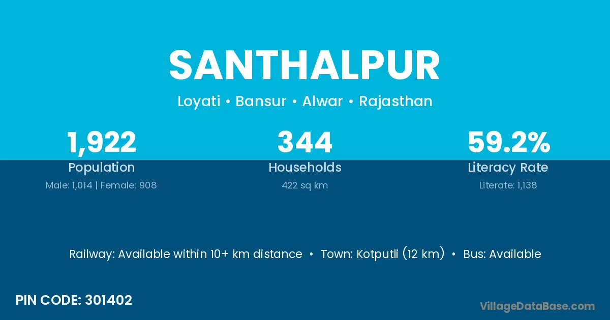 Kotputli (12 km) is the nearest town to Santhalpur village for major economic activities and is located approximately 12 km away.