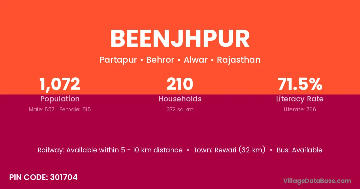 Rewari (32 km) is the nearest town to Beenjhpur village for major economic activities and is located approximately 32 km away.