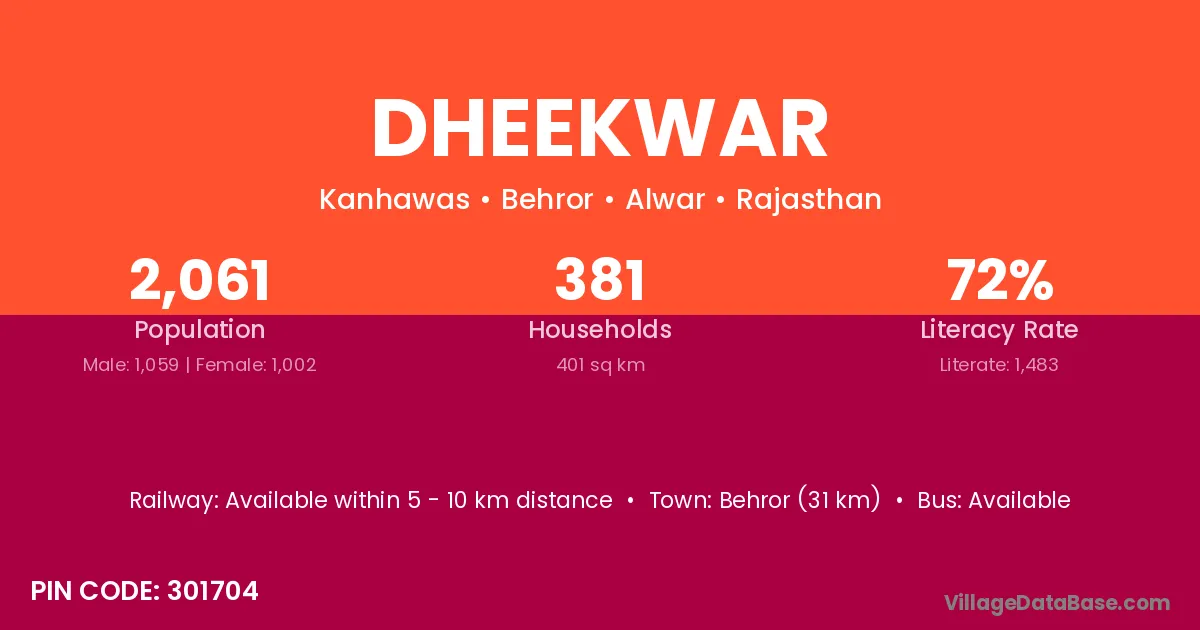 Behror (31 km) is the nearest town to Dheekwar village for major economic activities and is located approximately 31 km away.