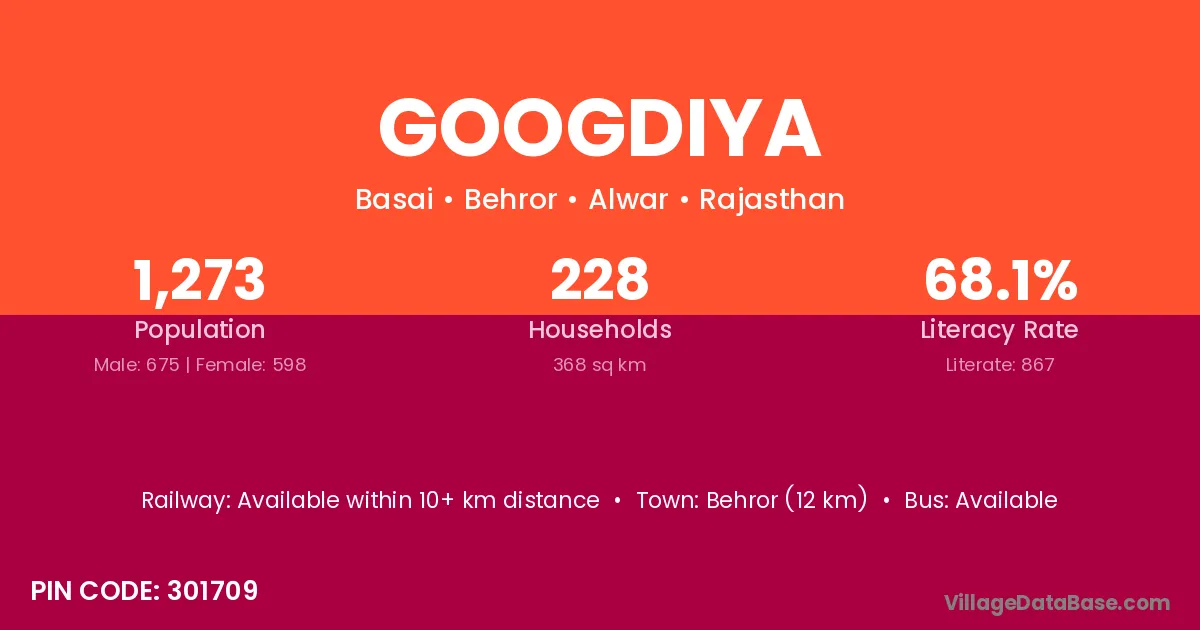 Behror (12 km) is the nearest town to Googdiya village for major economic activities and is located approximately 12 km away.