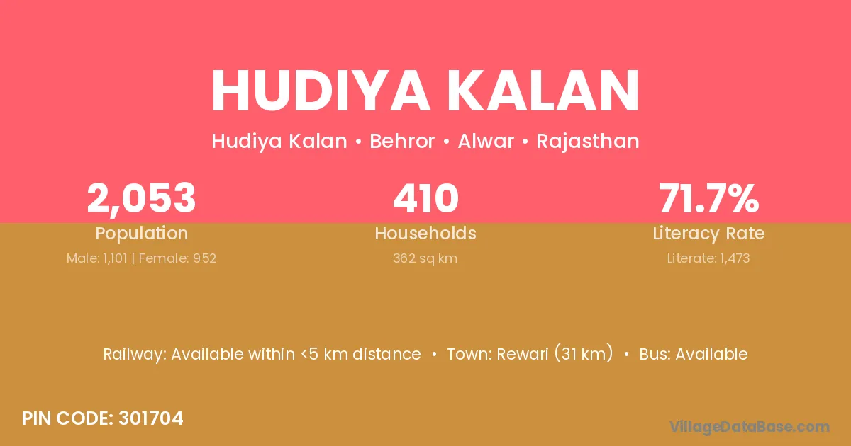 Rewari (31 km) is the nearest town to Hudiya Kalan village for major economic activities and is located approximately 31 km away.