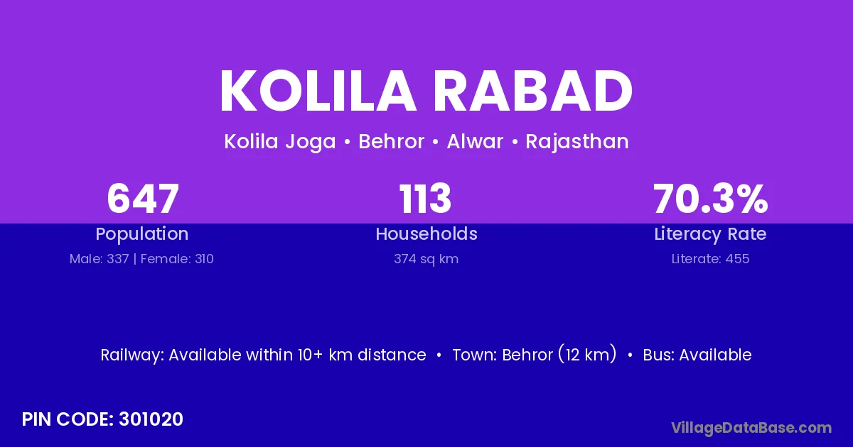 Behror (12 km) is the nearest town to Kolila Rabad village for major economic activities and is located approximately 12 km away.