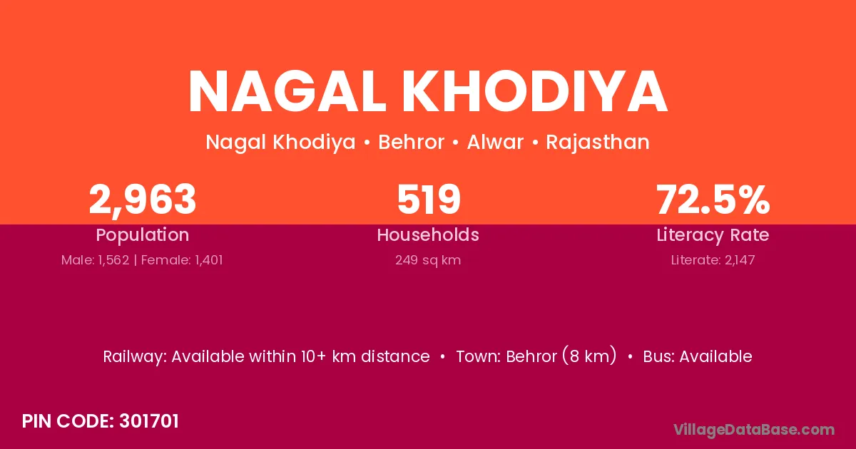 Nagal Khodiya village has a total population of 2,963 people, of which 1,562 are males and 1,401 are females.