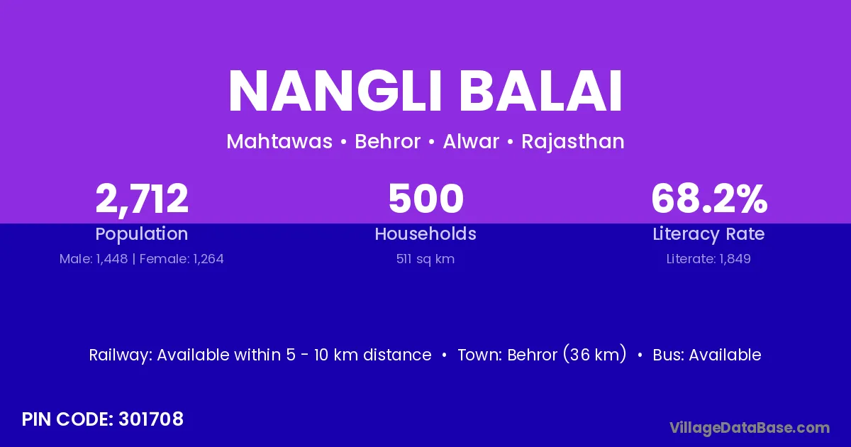 Behror (36 km) is the nearest town to Nangli Balai village for major economic activities and is located approximately 36 km away.