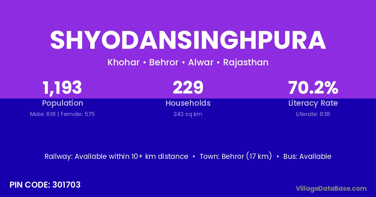 Behror (17 km) is the nearest town to Shyodansinghpura village for major economic activities and is located approximately 17 km away.