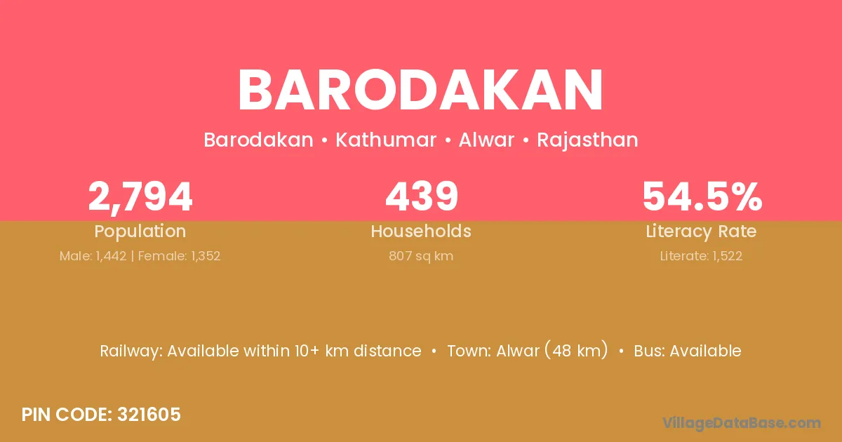 Alwar (48 km) is the nearest town to Barodakan village for major economic activities and is located approximately 48 km away.