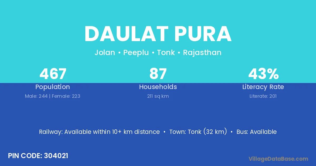 Kherli (15 km) is the nearest town to Daulat Pura village for major economic activities and is located approximately 15 km away.