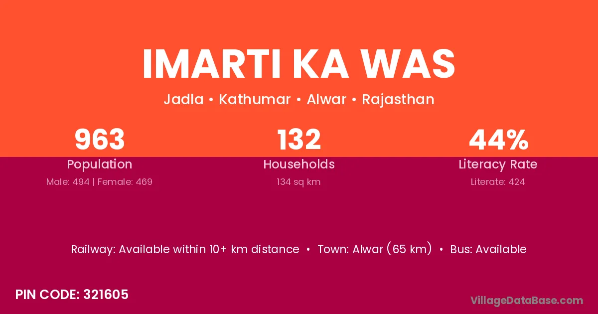 Imarti Ka Was village has a total population of 963 people, of which 494 are males and 469 are females.