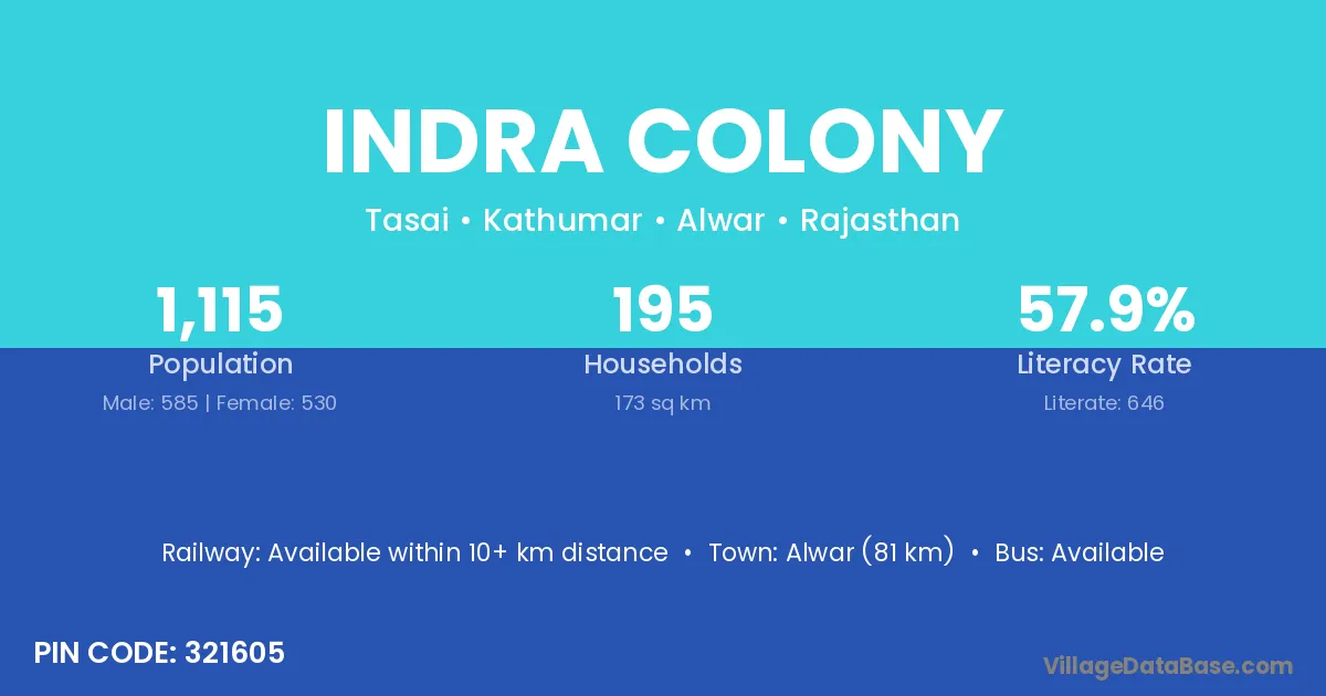 Alwar (81 km) is the nearest town to Indra Colony village for major economic activities and is located approximately 81 km away.