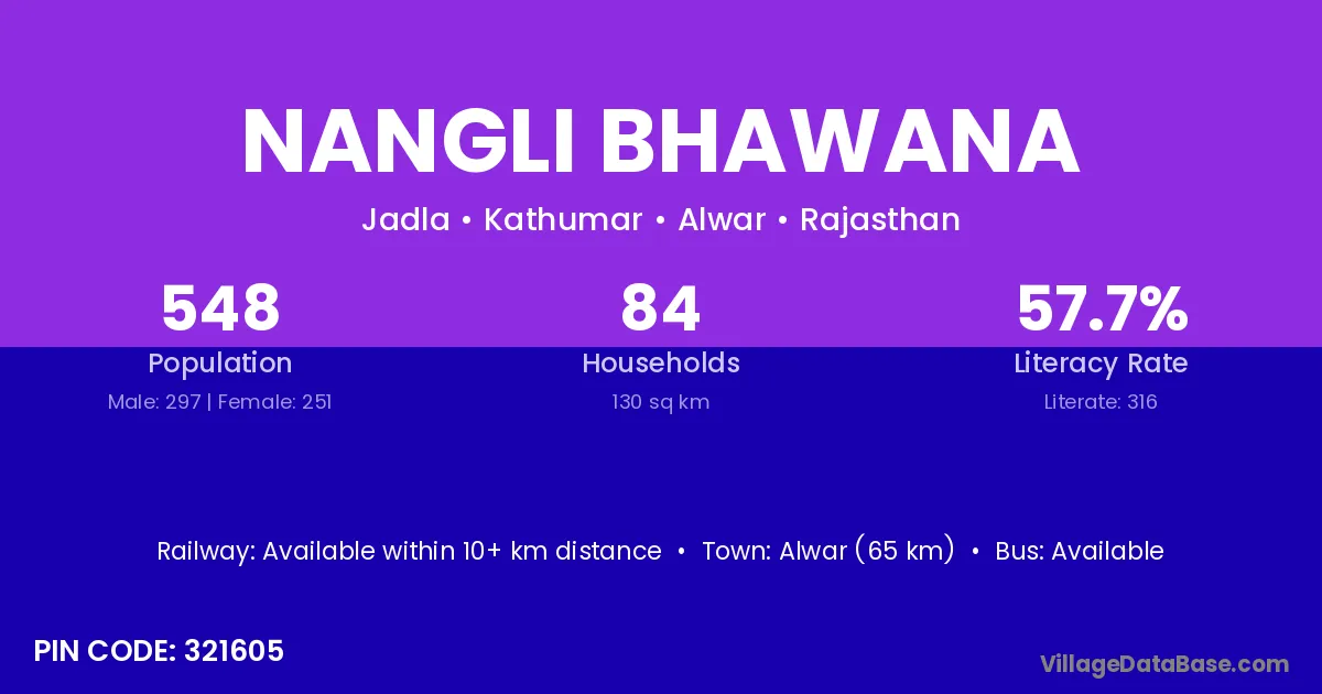 Alwar (65 km) is the nearest town to Nangli Bhawana village for major economic activities and is located approximately 65 km away.