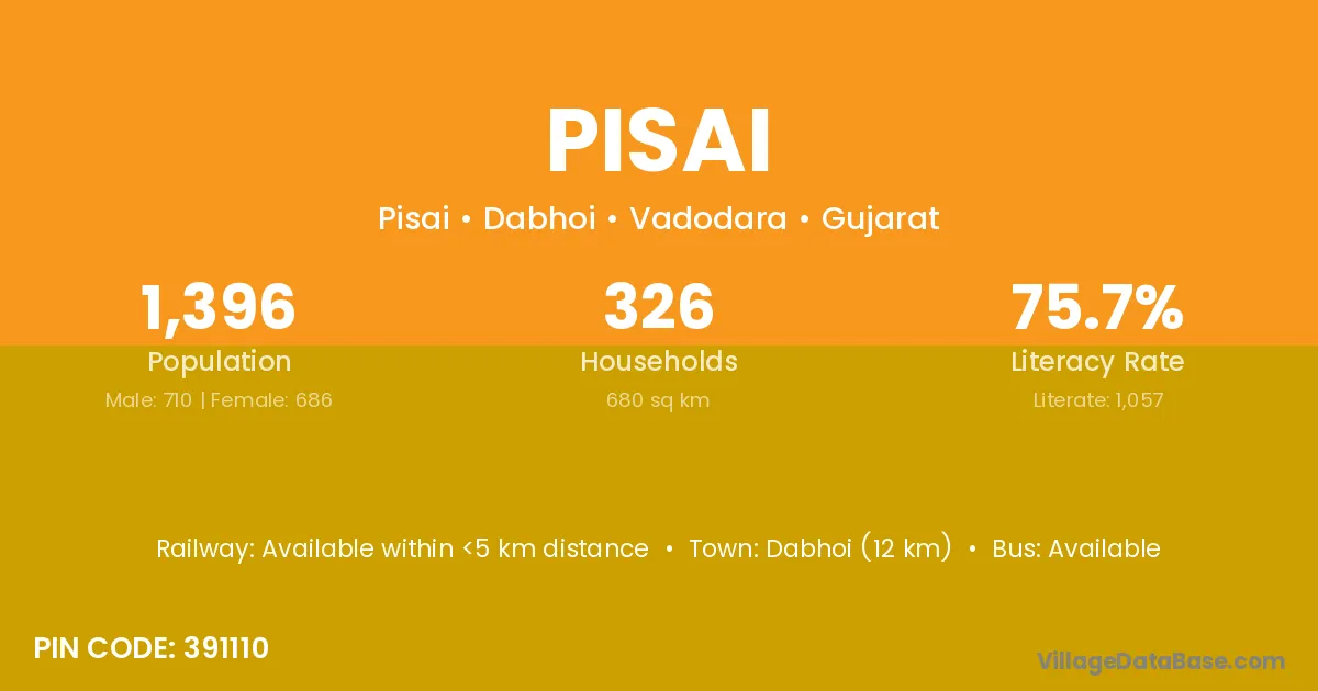 Pisai village has a total population of 1,299 people, of which 697 are males and 602 are females.