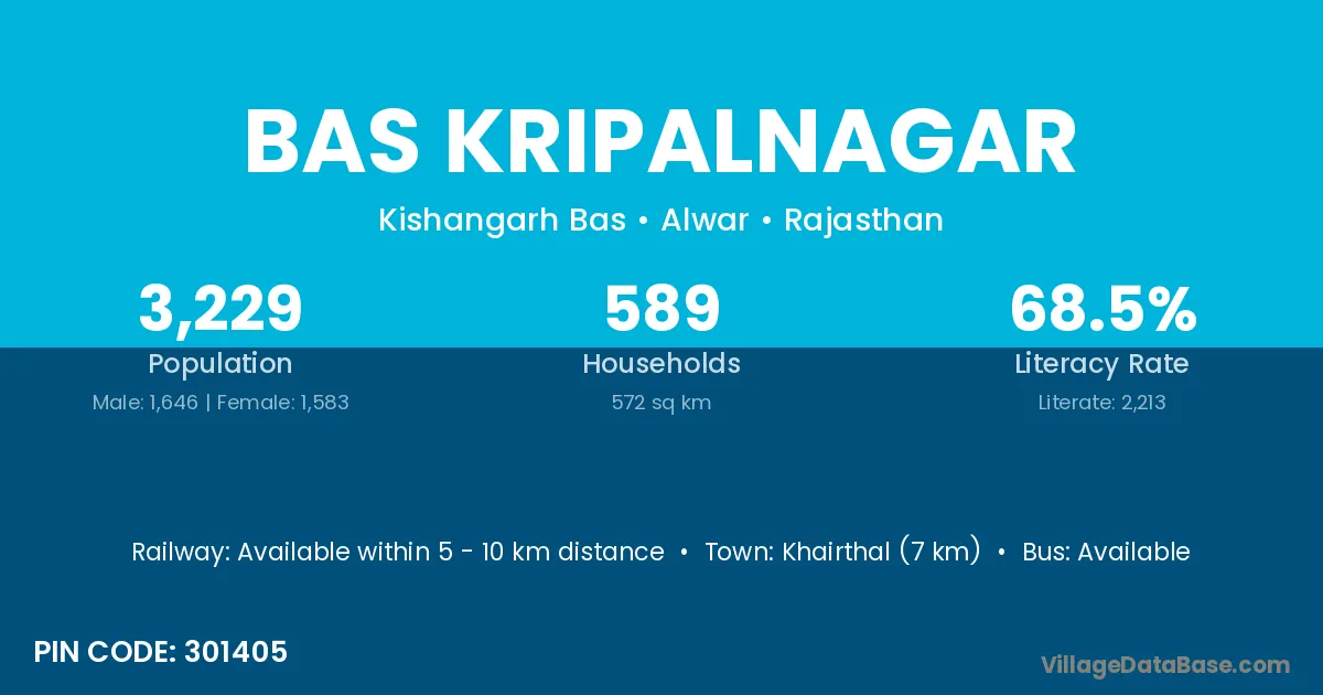 Khairthal (7 km) is the nearest town to Bas Kripalnagar village for major economic activities and is located approximately 7 km away.