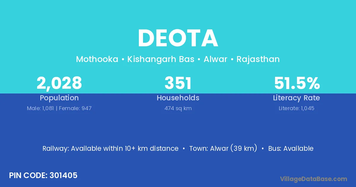 Alwar (39 km) is the nearest town to Deota village for major economic activities and is located approximately 39 km away.