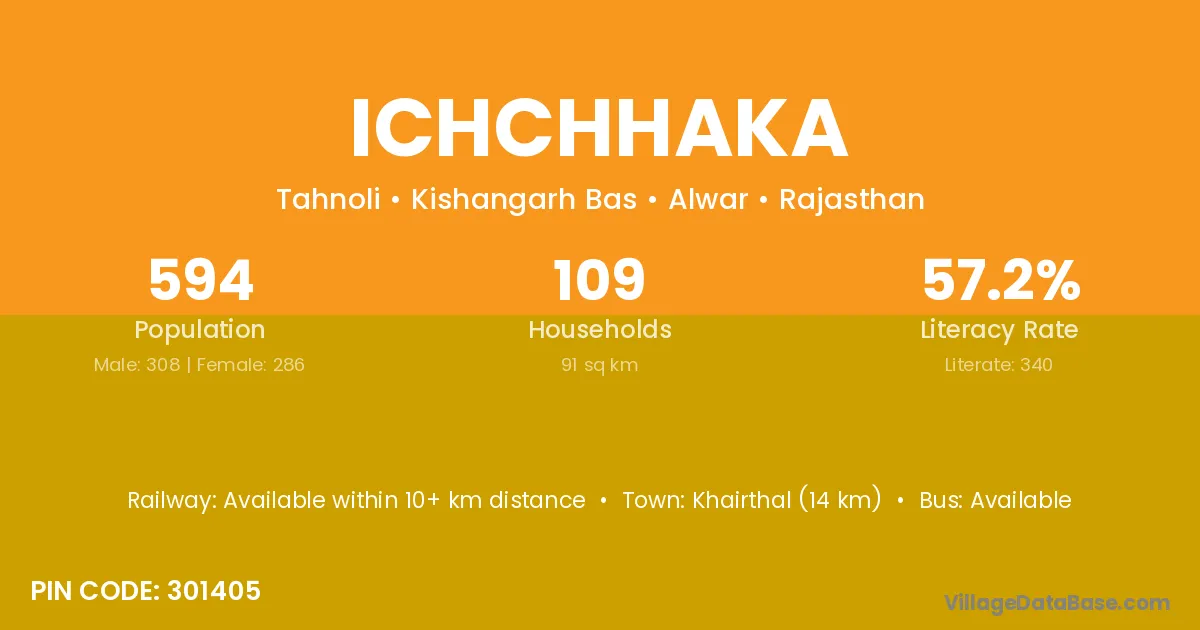 Khairthal (14 km) is the nearest town to Ichchhaka village for major economic activities and is located approximately 14 km away.
