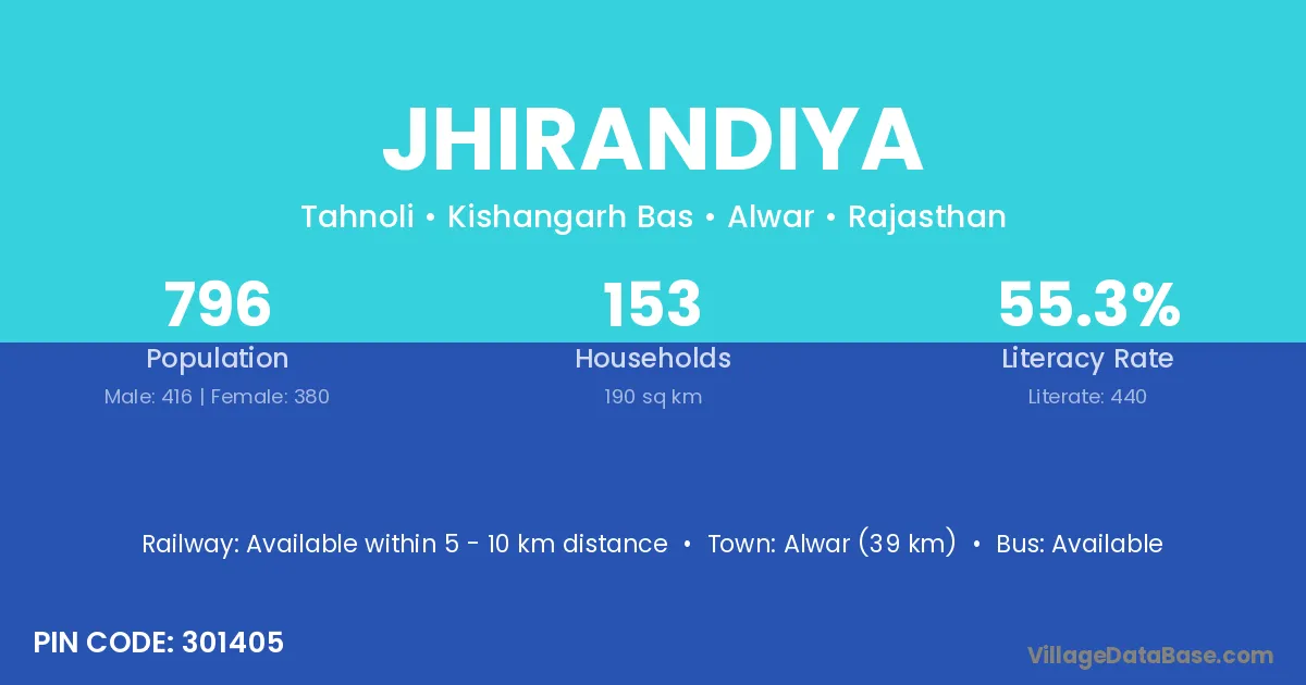 Alwar (39 km) is the nearest town to Jhirandiya village for major economic activities and is located approximately 39 km away.