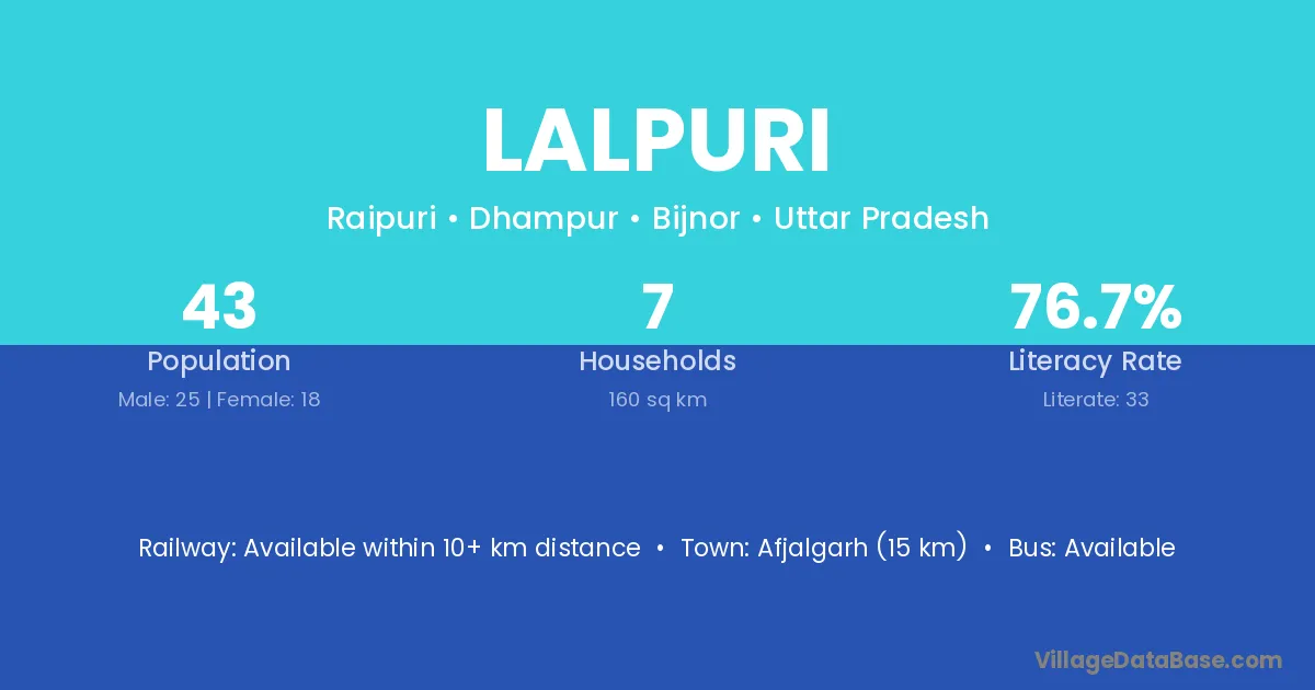 The literacy rate of Lalpuri village is 41.27%. Male literacy stands at 56.84% and female literacy at 25.53%.
