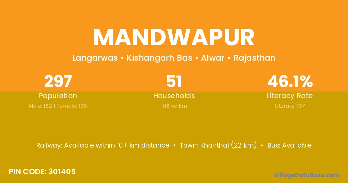 Khairthal (22 km) is the nearest town to Mandwapur village for major economic activities and is located approximately 22 km away.