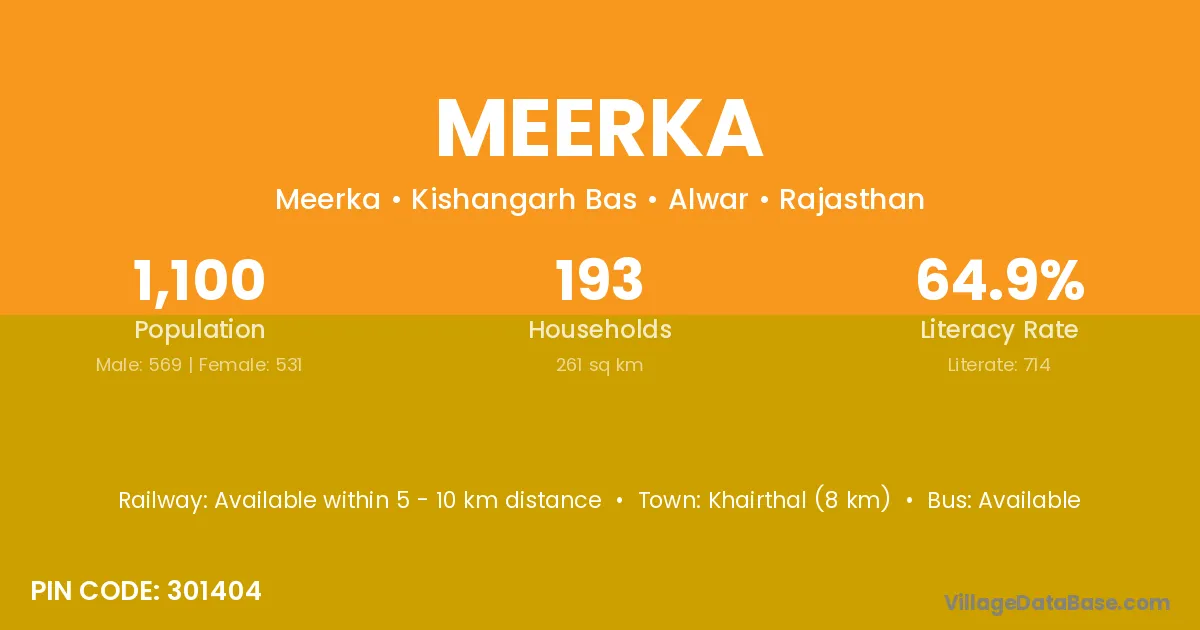 Khairthal (8 km) is the nearest town to Meerka village for major economic activities and is located approximately 8 km away.