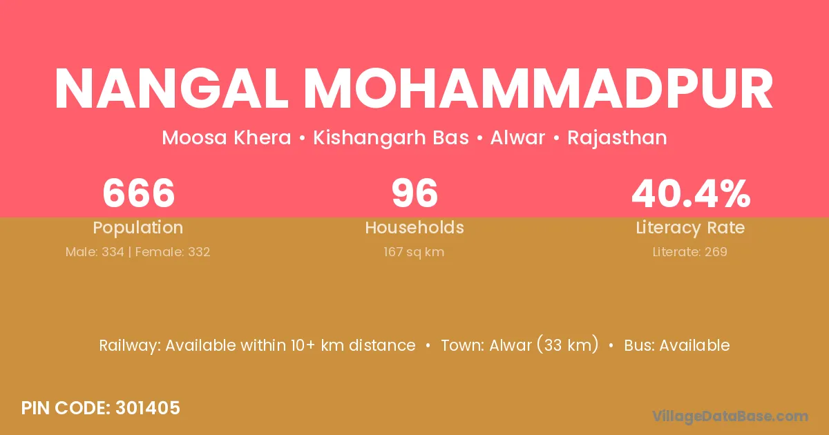Alwar (33 km) is the nearest town to Nangal Mohammadpur village for major economic activities and is located approximately 33 km away.