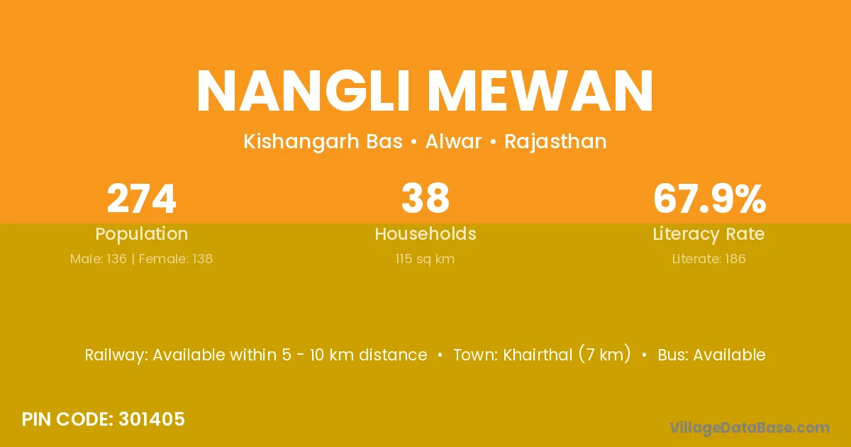 Khairthal (7 km) is the nearest town to Nangli Mewan village for major economic activities and is located approximately 7 km away.