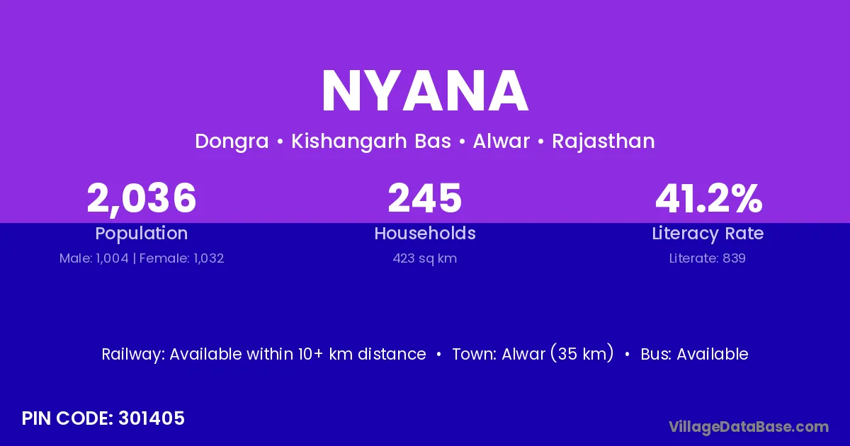 Alwar (35 km) is the nearest town to Nyana village for major economic activities and is located approximately 35 km away.