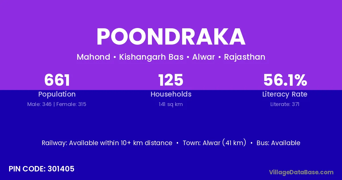Alwar (41 km) is the nearest town to Poondraka village for major economic activities and is located approximately 41 km away.