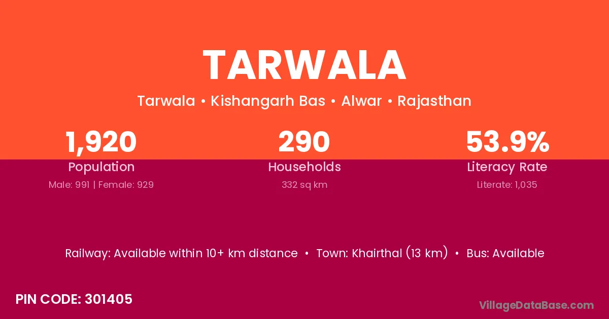 Khairthal (13 km) is the nearest town to Tarwala village for major economic activities and is located approximately 13 km away.